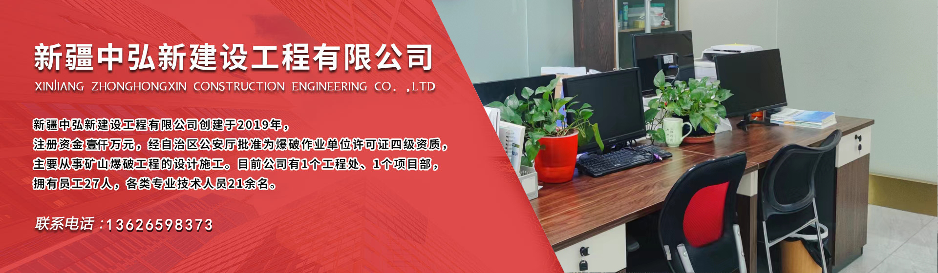 ZHONGHONGXIN CONSTRUCTION ENGINEERING   公 司 簡 介新疆中弘新建設(shè)工程有限公司創(chuàng)建于2019年,注冊(cè)資金壹仟萬元,經(jīng)自治區(qū)公安廳批準(zhǔn)為爆破作業(yè)單位許可證四級(jí)資質(zhì),主要從事礦山爆破工程的設(shè)計(jì)施工、礦上采掘施工業(yè)務(wù)。目前公司有1個(gè)工程處、2個(gè)項(xiàng)目部,分...